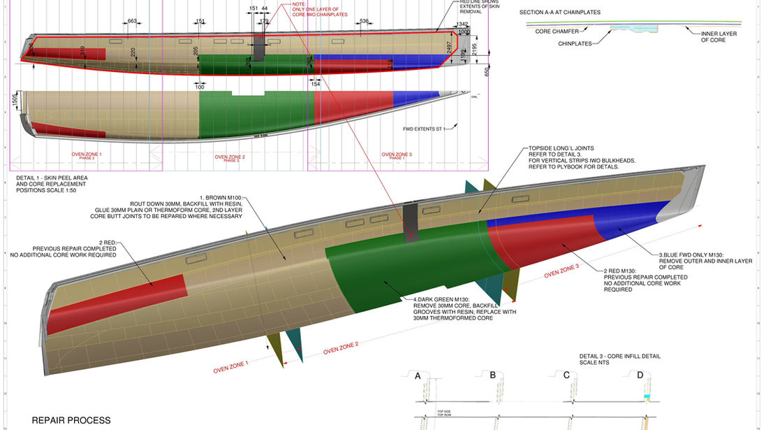 In 2017, 3DT collaborated with BM Composites in Mallorca on one of the most ambitious composite projects in boatbuilding history: the complete removal and replacement of the outer skin and core of a 35m sailing yacht, all while the vessel remained upright on cradles and without disturbing any interior furniture or equipment. The original outer skin was replaced with a Sprint Carbon Fibre system, which was laminated and cured at the STP shipyard in Palma.