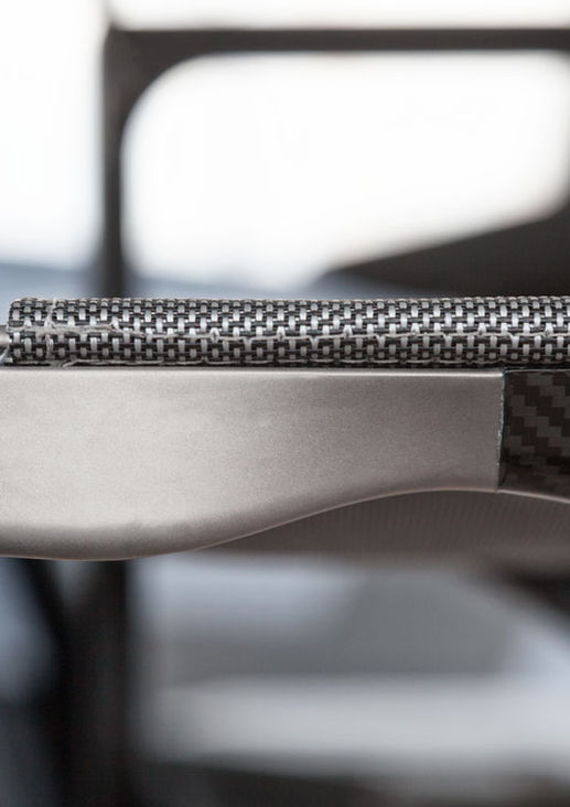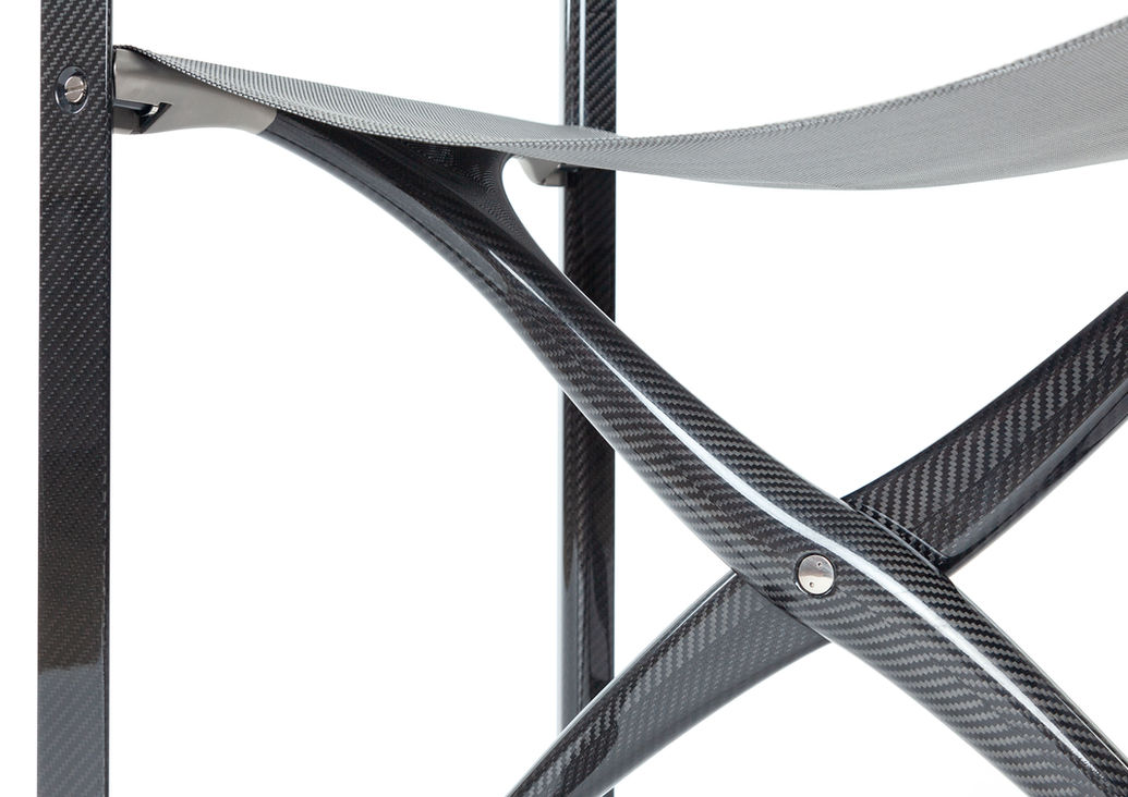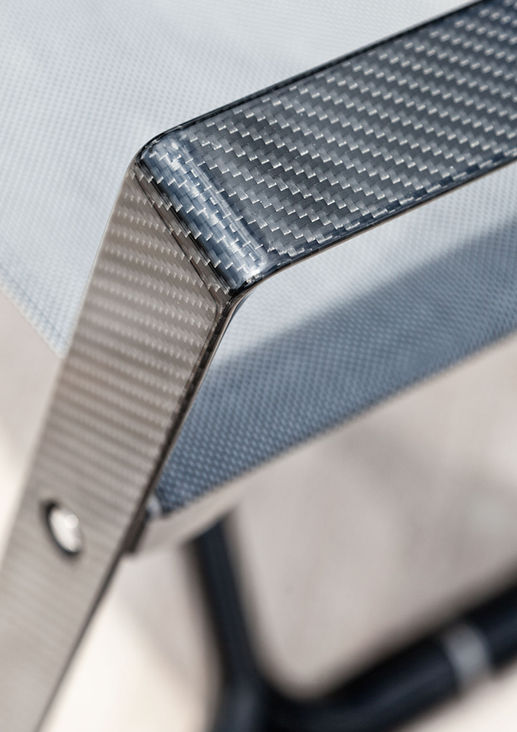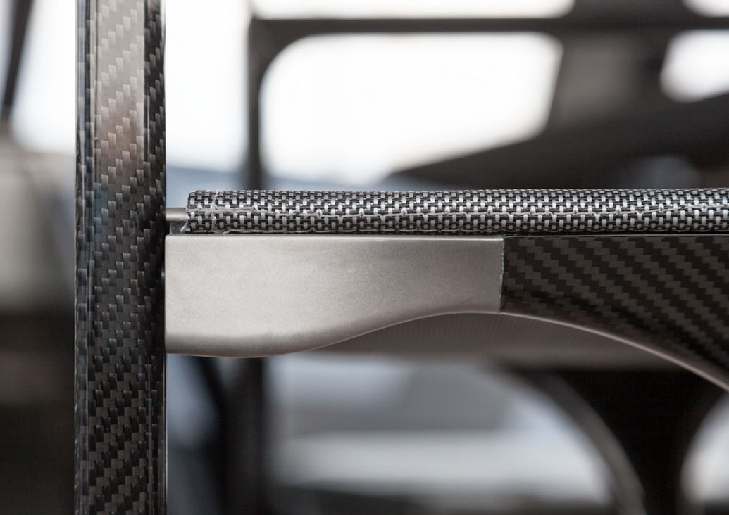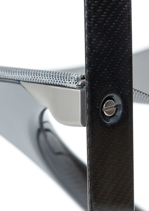 Every element was meticulously crafted to ensure no visible screws or bolts—a detail that proved challenging but was essential to the flawless design. The titanium end pieces and carbon legs join in a hidden, seamless connection, creating a look of effortless elegance. The seat fabric is flawlessly integrated into the legs and titanium pieces, disappearing completely into the structure as if it were one continuous piece.