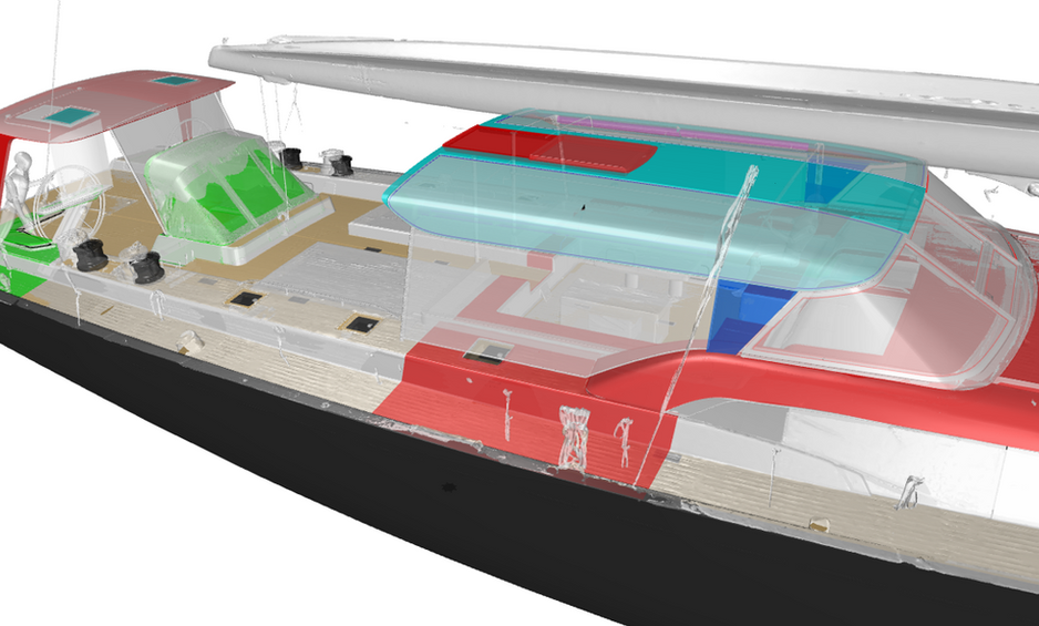 Styled by Nauta Design in Italy, with project ownership and production by BM Composites, 3DT was entrusted with the technical and tooling design of this ambitious project. The main bimini was far from ordinary—it featured drop-down hatches to house roll-up protection screens, a glass windscreen with an opening window, and a removable fabric cover that reflected the owner’s love for classic cars with fabric roofs.