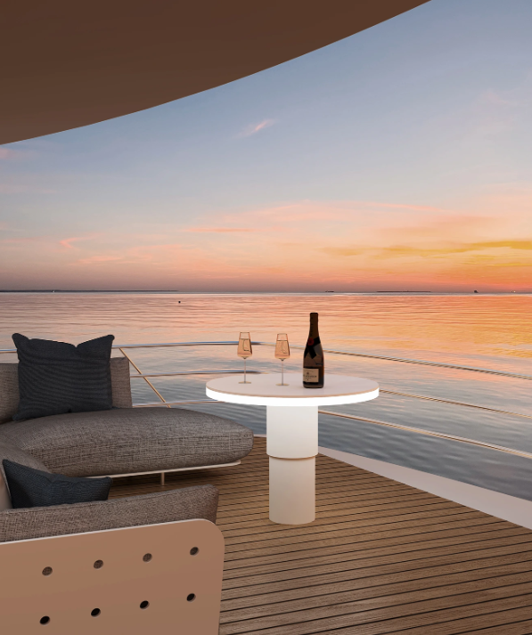 The table collection offered by Nautys provides versatile and innovative solutions, designed to adapt to various space and usage needs. Thanks to an advanced automated height adjustment system, the tabletops can easily transform, switching from a dining setup to a more informal configuration, perfect for chill or entertainment.