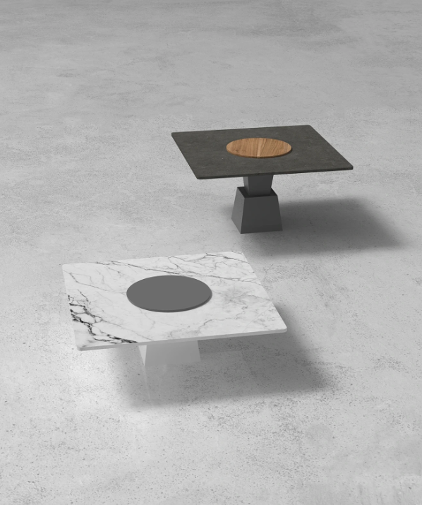 The range includes dining tables, bar tables, and coffee tables in different sizes, with floor fixation to ensure safe use aboard yacts. The variety of available materials, including HIMACS, wood, and ceramics, allows for elegant and dynamic contrasts, perfect for exclusive and refined environments.