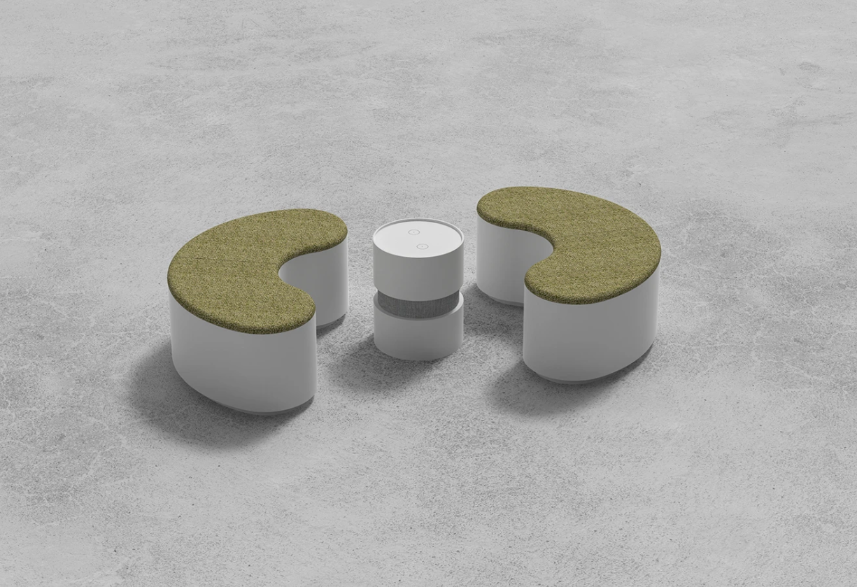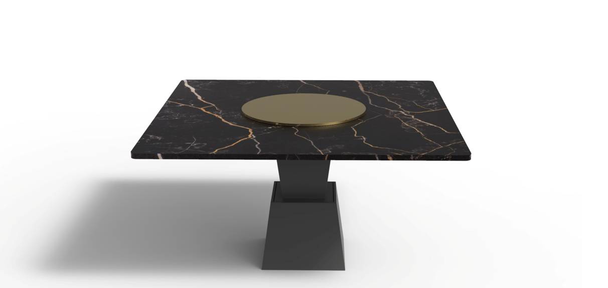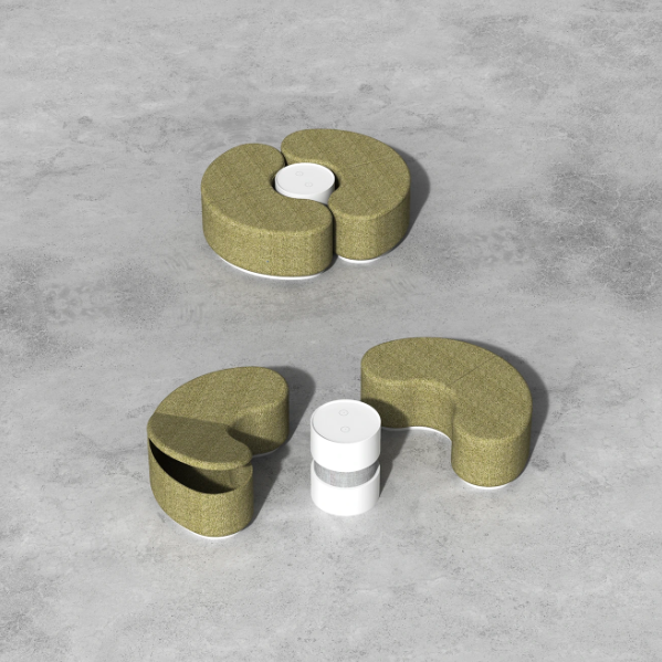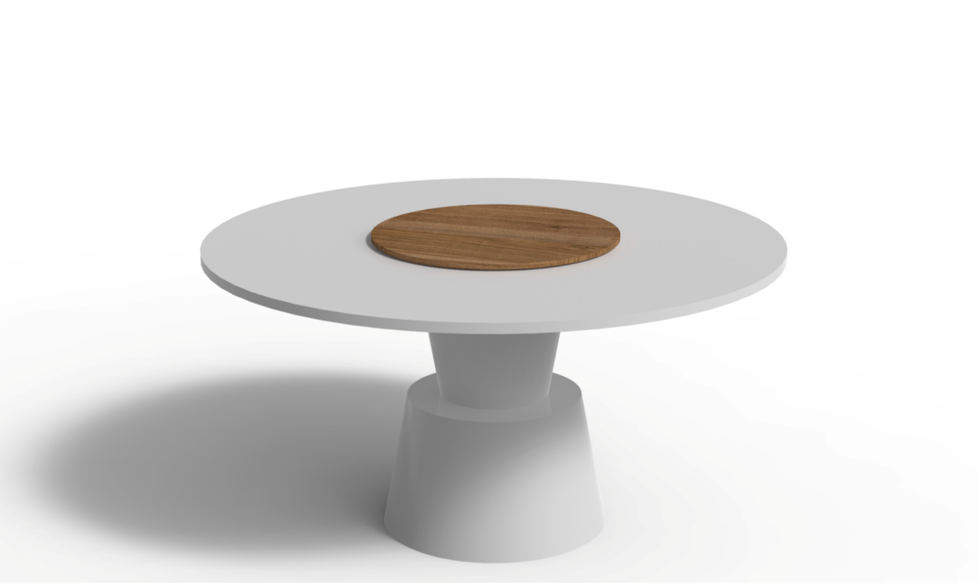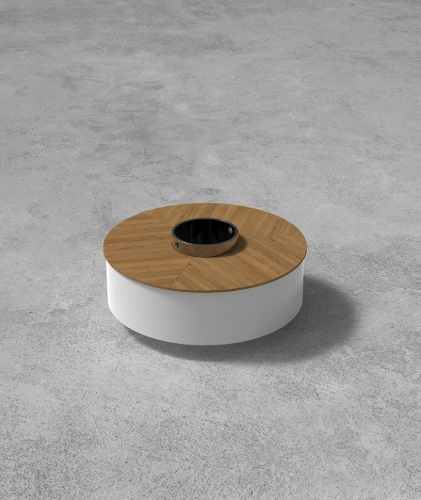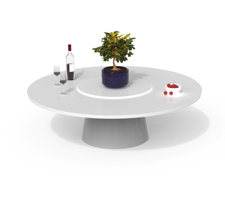 A pleasant composition of organic shapes that intersect and enclose a technological heart. When opened, the table reveals an integrated audio diffuser, designed to provide crystal-clear and immersive sound, enhancing the outdoor music experience.
