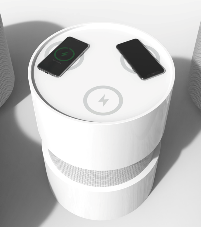 The top surface is equipped with two wireless charging stations, allowing for quick and safe smartphone charging, eliminating the clutter of cables and keeping the area always neat and elegant.