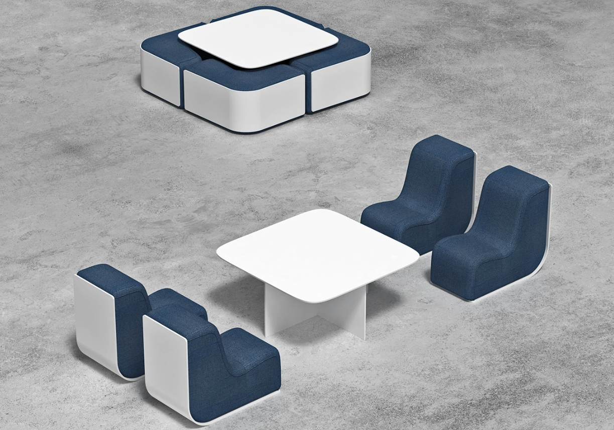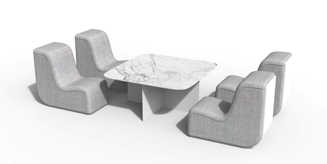 The poufs, ergonomic and comfortable, are designed to ensure optimal relaxation and, when not in use, can be easily stored around the table, transforming into a single compact structure. The combination of high-quality materials, such as HIMACS and weather-resistant fabrics, ensures durability and a refined aesthetic.