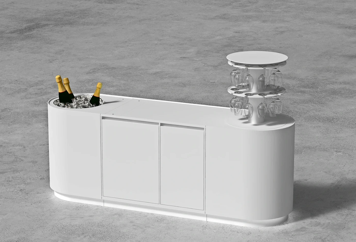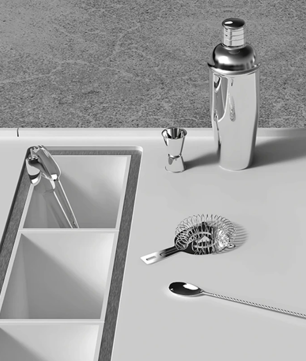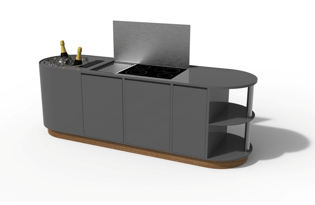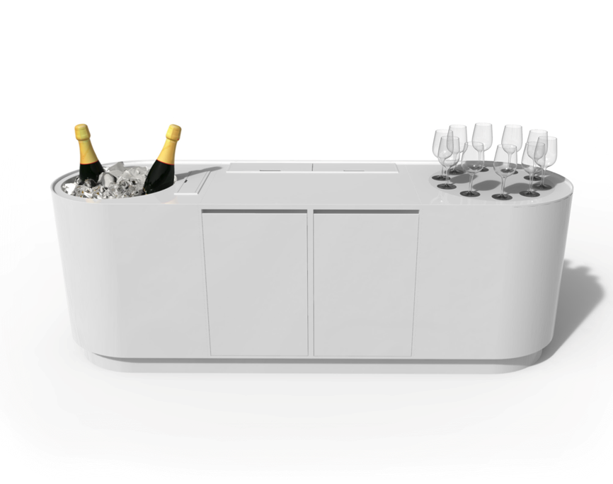 Its modular structure allows for the customization of each element based on specific needs, with configurations ranging from an equipped bar counter to a fully functional outdoor kitchen, thanks to accessories such as an integrated sink, equipped channel, storage compartments, and areas dedicated to beverage and cocktail preparation.