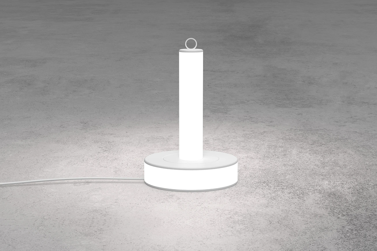 The circular base, which also serves as a luminous charging station, diffuses a soft and enveloping light, perfect for creating relaxing atmospheres.