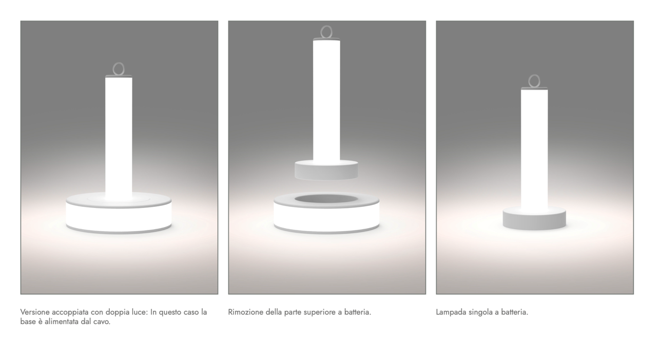 At the top, the removable light unit, equipped with an integrated battery, can be detached with a simple gesture and carried anywhere an additional light source is needed.